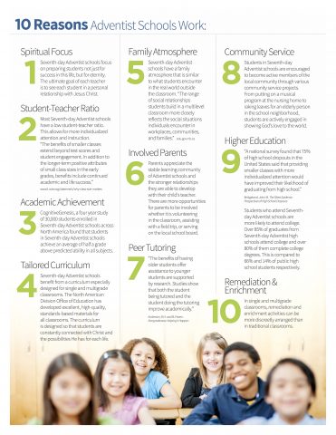 The Adventist education system dates back to the mid 1800s and has become one of the largest Christian education systems in the world with 85,000 teachers, 1.5 million students, and 7,500 schools in nearly 150 countries. Learn more about the benefit an Adventist education could have for your student(s) through the resources below.